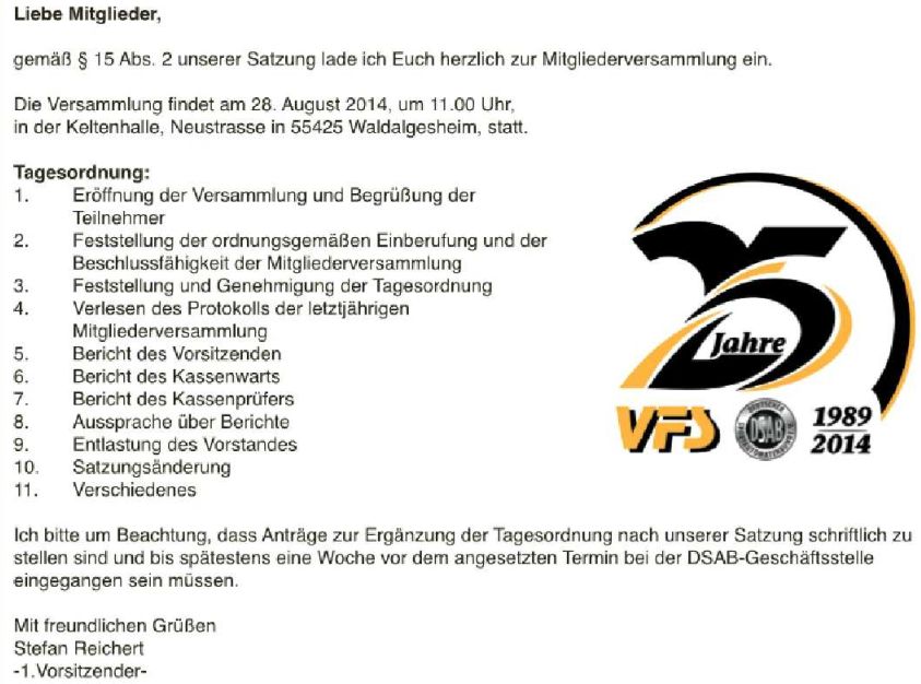 Auch diesmal sage ich: Es wurde nicht korrekt eingeladen, die Mitglieder müssen im Vorfeld über die Details der geplanten Satzungsänderung informiert werden, d.h. mit der Einladung. Auch ein DSAB und VFS kann sich nicht über das BGB hinwegsetzen.